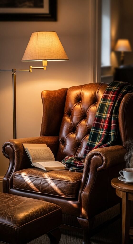 A deep leather chair creates the perfect reading corner. Check Craigslist for used pieces with good bones but worn leather—that’s the look you want. Faux leather from Target works on tight budgets and ages authentically. Add a wool throw and velvet pillow for texture contrast. Position near a lamp for late-night reading sessions. The chair becomes your dedicated thinking spot over time.