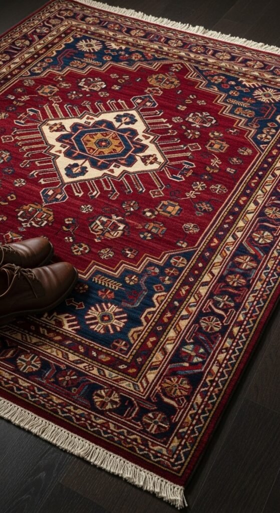 Layered rugs ground a room and add color without paint. Shop rug outlets or Wayfair sales for machine-made versions under $200. Real vintage Persians appear at estate sales for $100-300 if you’re patient. Deep reds, navy blues, and forest greens fit the aesthetic best. Place under your desk area or reading chair to define zones. Vacuum regularly but embrace slight wear as authentic character.