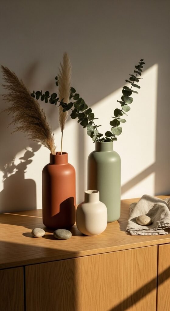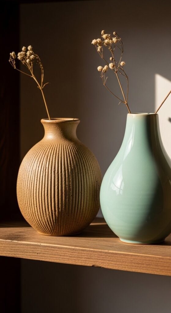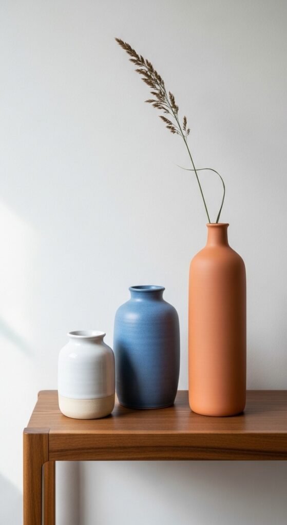 Grouping in threes is one of the oldest styling tricks — and it works. Place a tall, medium, and short vase together with slight gaps between them. Don’t line them up perfectly. Stagger them slightly so they feel organic. Mix finishes: one glossy, two matte. One vase can hold a single dried stem — the others stay empty. This creates breathing room. You can find mismatched ceramic vases at thrift stores for under $5 each. Start there.