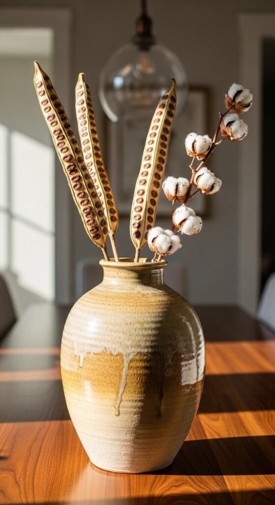 Sometimes one vase does more than five. Choose a larger piece with interesting texture — a handmade stoneware look, a rippled glaze, or a sculptural neck. Place it dead center on your dining table with just two or three stems inside. Dried cotton, seed pods, or oversized eucalyptus all work well. This approach feels intentional without being fussy. Look for oversized ceramic vases at HomeGoods, TJ Maxx, or Facebook Marketplace. Budget: $15–$30.