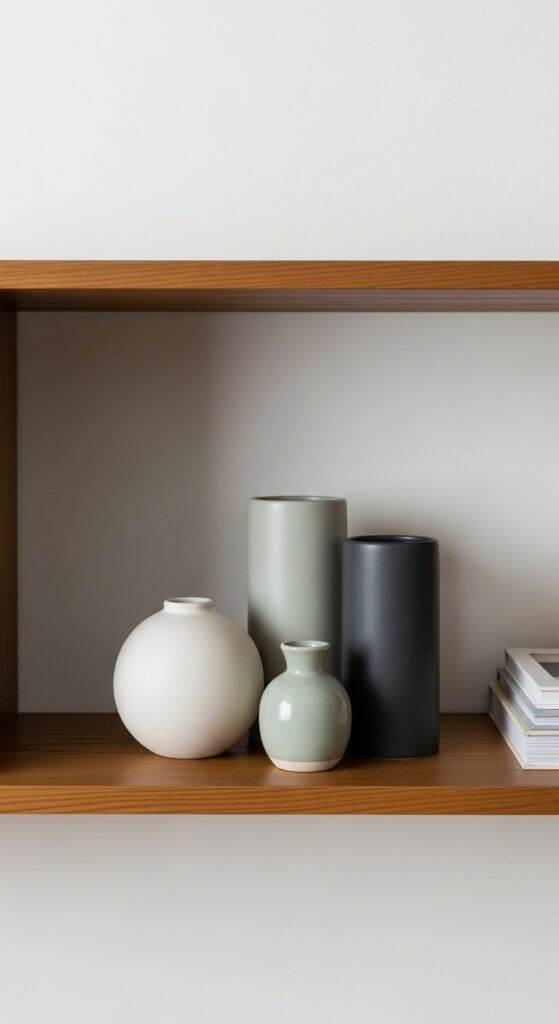 Open shelves get messy fast. Anchor one end of a shelf with a small ceramic grouping. Use a tall slim vase, a round squat piece, and a tiny bud vase together. Keep the color palette tight — two neutrals and one earthy tone. Leave some empty space on the shelf so the vases can breathe. You don’t need to fill every inch. This trick makes shelves look styled, not crammed. DIY tip: paint plain dollar store vases with chalk paint for a custom matte look.