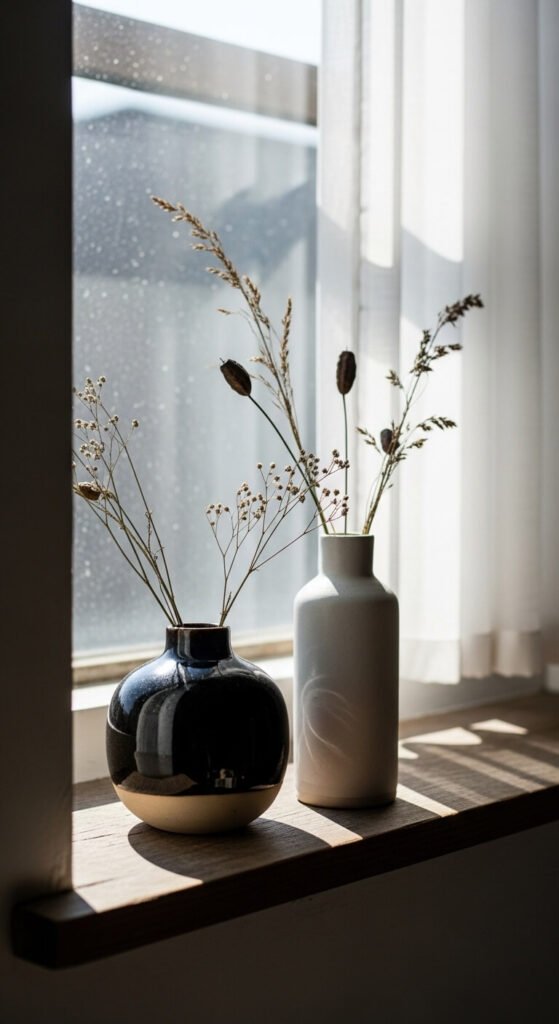 Window ledges are underused. A small ceramic vase backlit by natural light creates instant drama. The silhouette of a round or tapered vase against a bright window looks like a still-life painting. Choose dark glazed pieces for maximum contrast, or go pure white for an airy effect. Keep it to one or two vases so the sill doesn’t feel cluttered. Dried branches or single stems look especially striking from this angle. No budget needed — just reposition what you already own.