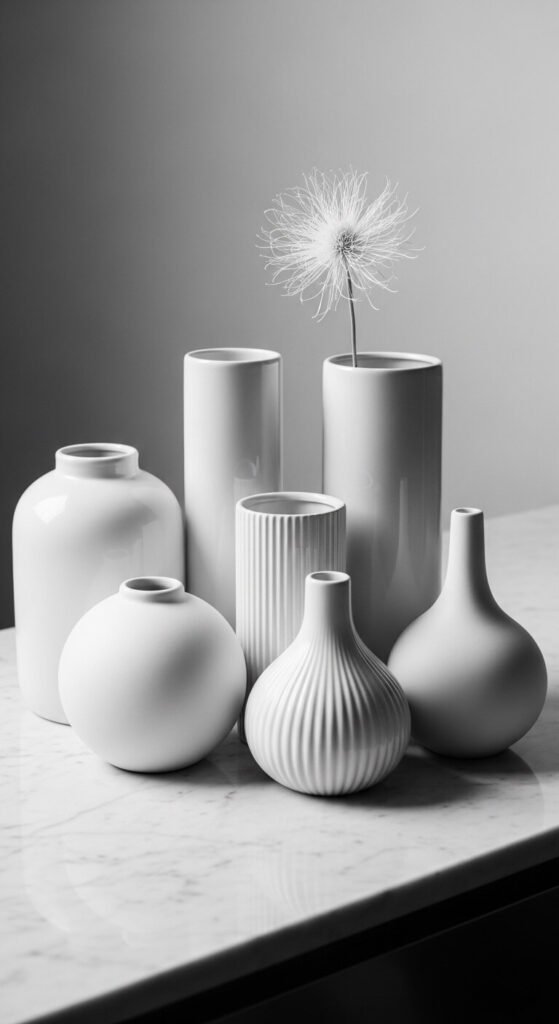 An all-white arrangement sounds boring. It isn’t. When you use different shapes and textures in the same color, the forms do all the talking. Group five white vases — tall, short, fluted, round, and ribbed — together on a countertop or mantle. The variation in silhouette creates movement. Add one small white dried bloom to one vase for a subtle detail. Shop white ceramic vases at IKEA or Amazon. A set of five can cost less than $25 total.