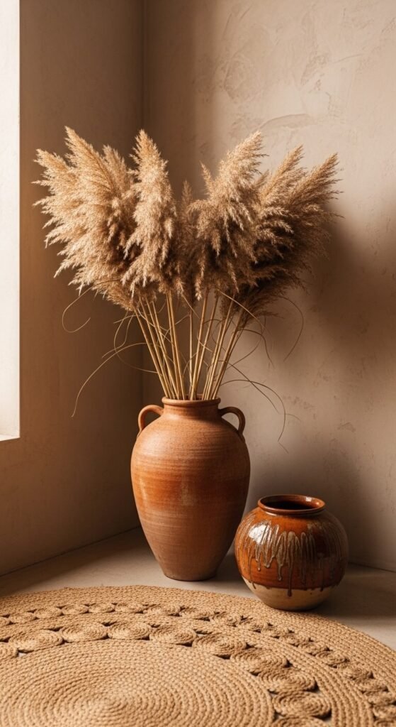 Floor vases change the scale of a room. A large terracotta or rust-toned ceramic on the floor next to a couch or armchair fills awkward empty corners perfectly. Add pampas grass or dried palm for height. Place a smaller complementary vase nearby at ground level to echo the larger piece. This earthy, layered look is a staple of boho interiors. Large floor vases can be found at HomeGoods, Target, or even garage sales. Most cost $20–$50.