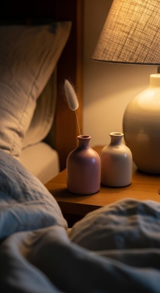 Two small vases on a nightstand create symmetry without feeling formal. Choose bud vases — one holding a single dried flower, one empty. Dusty rose, ivory, sage, and terracotta all work well with bedroom color palettes. Keep them small so they don’t overwhelm the surface. This is one of the easiest and most affordable ways to make a bedroom feel more intentional. Look for bud vases at craft fairs or Etsy shops. Sets of two often run $10–$15.