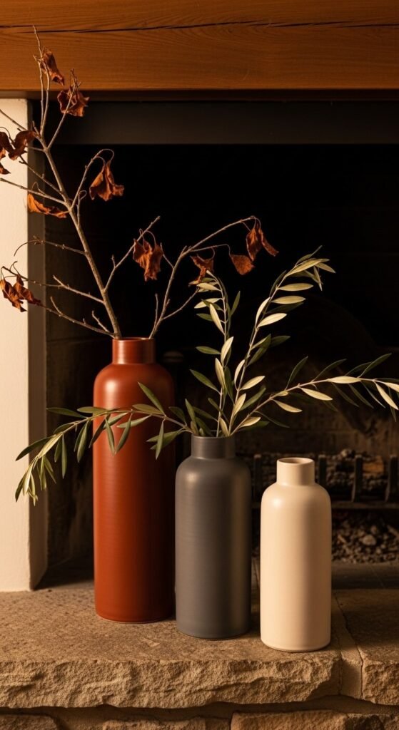 Fireplace hearths are natural stages for floor-level arrangements. Group three ceramic vases in different heights — one tall, one medium, one small — directly on the hearth. Fill the taller ones with dried branches or olive stems for height. Leave the smallest one empty. Rust, charcoal, and cream create a warm, fireplace-friendly palette. Don’t push them back — let them extend slightly forward for a more natural look. Thrift stores often have great finds for this kind of low-commitment arrangement.