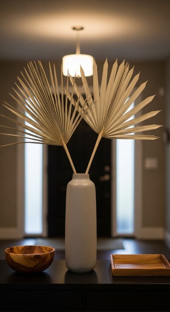 Your entryway sets the tone for your whole home. A taller ceramic vase with long dried palm fronds or grasses immediately signals intention. Go for something with a subtle glaze — stone, bone, or dark charcoal. Place it to the side of the table rather than centered for a more casual look. Keep the rest of the surface clean so the vase gets full attention. Tall narrow ceramic vases are widely available at Target and Amazon for $18–$35.