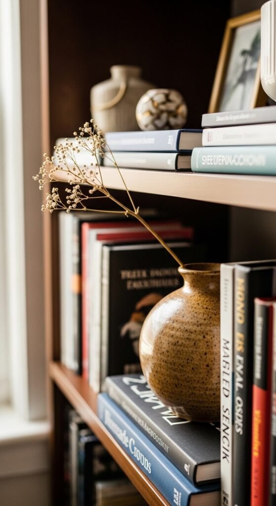 Books and ceramics are natural partners. Tuck a small round vase between book stacks for an unexpected detail. Lay some books flat to create a platform, then place the vase on top. This creates layers and depth. A speckled or mottled glaze looks especially good against book spines. You don’t need a large vase here — something the size of your fist is plenty. This works in any room with a bookshelf, from home offices to living rooms.