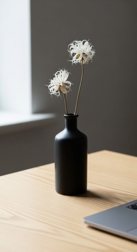Even a small vase on a desk makes a workspace feel less sterile. A matte black or dark navy mini vase with a single dried bloom is all you need. Keep it at the corner of the desk so it doesn’t interrupt your workflow. It adds a human touch to a functional space. Dried flowers are the right call here — no water, no maintenance. Small black ceramic vases are easy to find on Etsy for around $8–$12. One stem is enough.