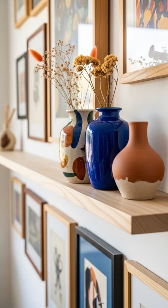 Wall shelves beneath gallery walls are a secret styling weapon. Add two or three small ceramic vases in contrasting styles — one patterned, one solid, one textured. The mix creates an “collected over time” feel rather than a matched-set look. Vary the colors slightly: one cobalt, one terracotta, one cream. Keep the stems simple. This approach works especially well in living rooms and hallways. You can mix vases from completely different stores without it looking chaotic.