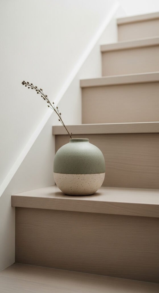 Stair steps are overlooked display surfaces. A single medium-sized ceramic on a mid-stair step — placed against the wall — creates a moment of surprise. It works best in entryways where the staircase is visible from the front door. Use a squat, stable shape so there’s no tipping risk. Don’t crowd multiple steps — one well-placed vase is enough. Round and low-slung ceramic shapes are safest here. They feel deliberate without looking like a safety hazard.