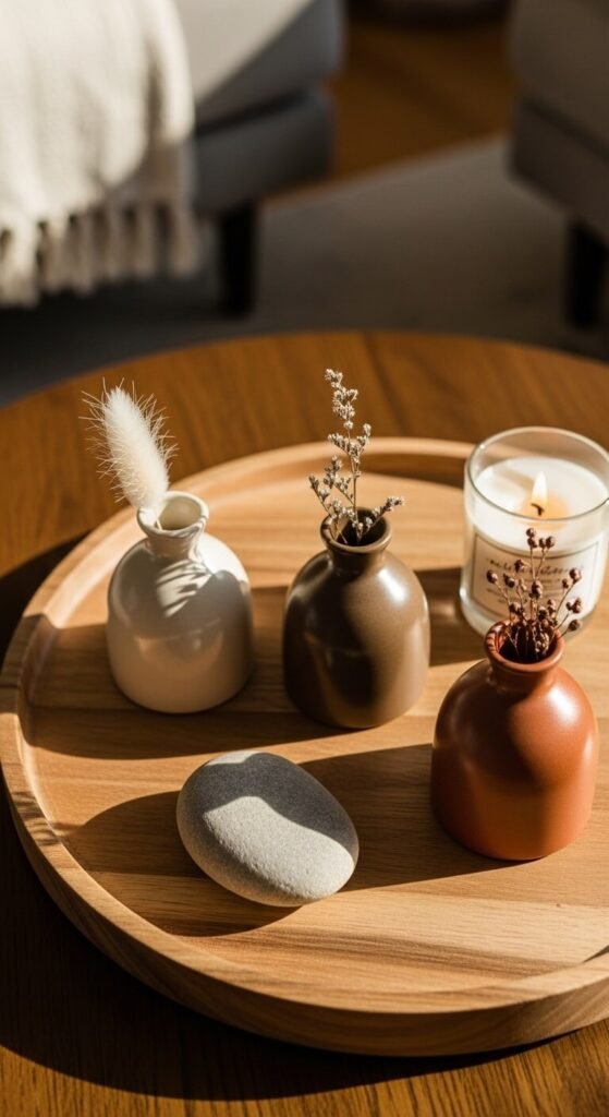 Trays do the heavy lifting when styling coffee tables. Group three small ceramic bud vases inside a round wooden or rattan tray. Mix in a candle and one or two small stones. The tray acts as a boundary, so the arrangement looks intentional rather than scattered. Use three vases in the same color family but slightly different shapes. Fill each with a different tiny dried botanical. The whole setup costs under $30 if you source from thrift stores and craft stores.