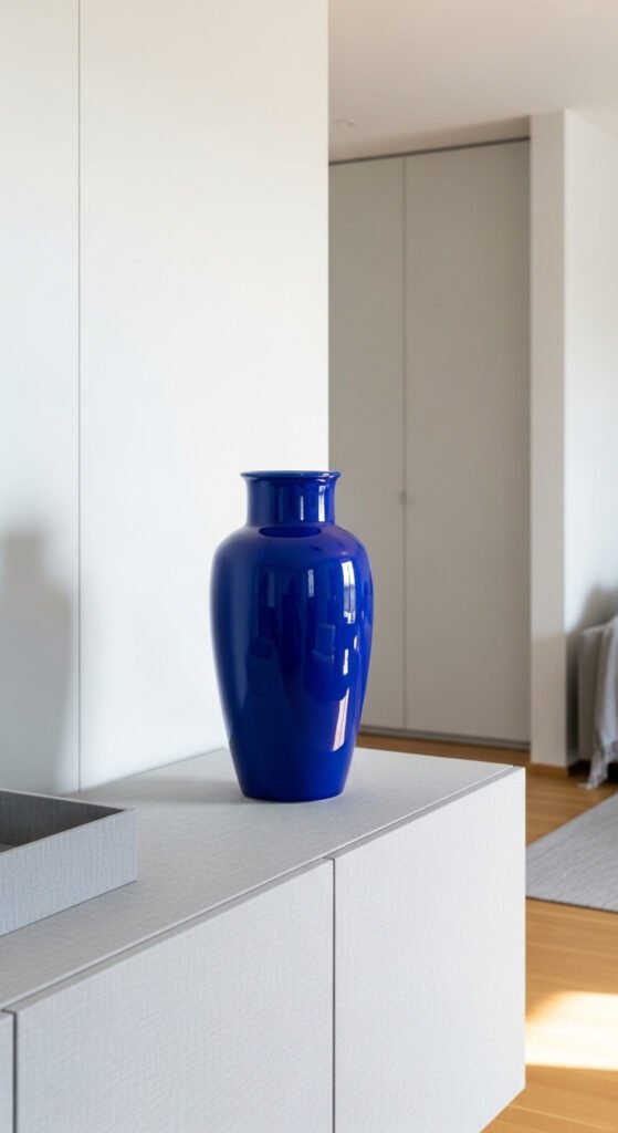 One colored vase in an otherwise neutral room becomes instant art. A cobalt blue, forest green, or deep burgundy ceramic against white walls or gray furniture pops without overpowering. Keep everything else on the surface plain. This is the easiest way to add color to a room without repainting or buying new furniture. The vase does all the work. You can rotate the color seasonally — a warm terracotta in fall, a cool green in spring — for an easy refresh.