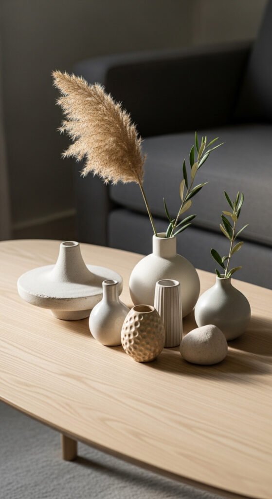 Low, flat ceramic vessels are underrated for coffee table styling. Mix a flat disc vase, a small round piece, and a tiny cylinder together in a loose cluster at the center of the table. Keep two of them empty so the arrangement doesn’t feel heavy. The low profile keeps sightlines open for conversation. This kind of arrangement works with whatever you already have — even small clay bowls or pinch pots count. Reframe what you consider a “vase” and your options double.