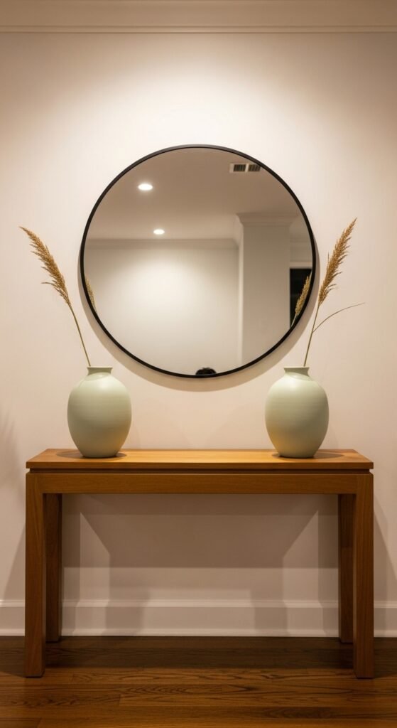 Symmetry signals calm and order. Flanking a mirror or piece of wall art with two identical or near-identical ceramic vases creates a clean, pulled-together look. Use the same vase shape on both sides — same height, same color. Add a single dried stem to each. The mirroring effect satisfies the eye instantly. This works especially well on entryway console tables and over fireplaces. IKEA’s PADRAG and similar basic vases make great affordable bookends for this kind of arrangement.