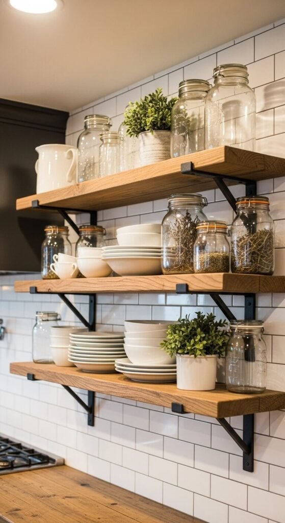 Open shelves replace upper cabinets in farmhouse kitchens. Reclaimed wood shelves on black iron brackets cost $40-80 per shelf installed. Simple pine boards run $20-30 each.