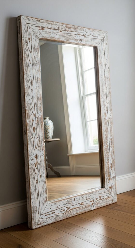 Lean large mirrors against walls rather than hanging. The casual placement feels less formal. Hang smaller mirrors in groupings on empty walls. The aged frames complement other rustic wood pieces.