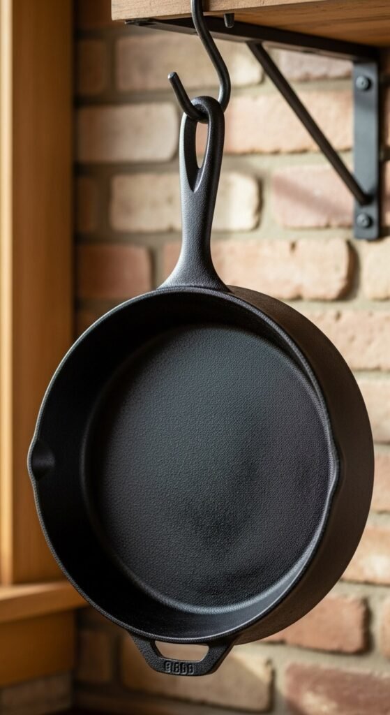 Hang on pot racks or wall-mounted hooks. The matte black finish contrasts beautifully with white kitchens. Use regularly—they improve with age and cooking. The weight and durability outlast modern nonstick pans.