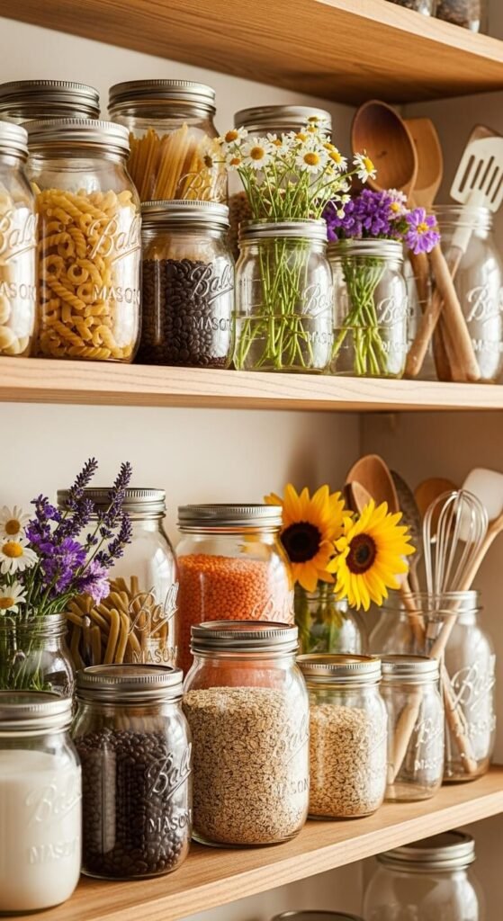 Use quart jars for drinking glasses. Pint jars hold bathroom cotton balls or Q-tips. Line them up on open shelves filled with pasta, rice, and beans. Instant farmhouse pantry.