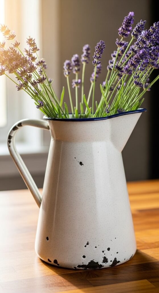 White enamelware with chips and worn edges screams authentic farmhouse. Hunt for pitchers, colanders, bowls, and coffee pots at antique shops. Expect to pay $8-25 per piece.