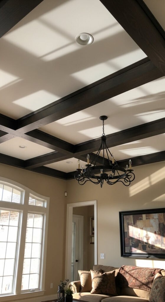 Stain them dark walnut or ebony for contrast against white ceilings. Space them evenly, typically 3-4 feet apart. Two or three beams make bigger impact than covering the entire ceiling.