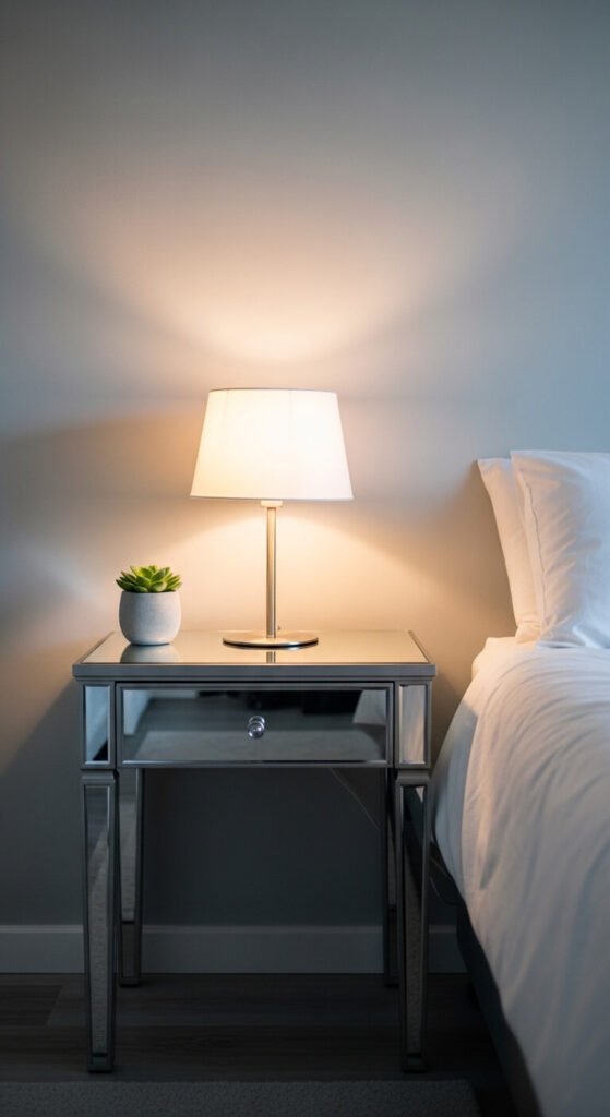 You don’t have to hang a mirror to get the benefits. Mirrored furniture does the same work quietly. A mirrored nightstand, side table, or dresser front reflects light at a low level, which brightens the base of a room that often sits in shadow. Look for mirrored furniture at thrift stores or search for vintage pieces on resale apps — they’re often very affordable. Even a mirrored tray on a coffee table counts. Small reflective surfaces add up fast.