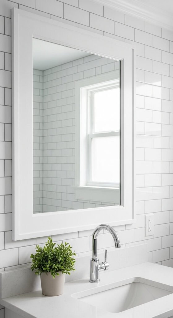 Builder-grade bathroom mirrors look plain — but you can transform them cheaply. Glue simple wood trim directly onto the mirror’s edge to create a custom frame. Paint it white, black, or gold. This DIY takes about two hours and costs under $20 in materials. The result looks like something from a high-end renovation. Use mirror adhesive and painter’s tape to hold the molding while it dries. It’s one of the easiest upgrades you can make without removing anything.