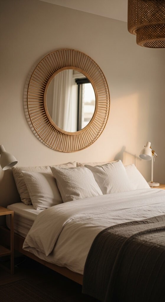 Round mirrors soften bedroom spaces where hard angles can feel cold. They work especially well above a bed as an alternative to traditional headboards or art. A large circle in natural rattan, wood, or brushed gold adds warmth and texture while keeping things airy. Look for 30–36 inch diameter options for best visual impact. Hang it centered above the bed at eye level when seated. It creates a cozy, intentional focal point that’s far cheaper than a real headboard.