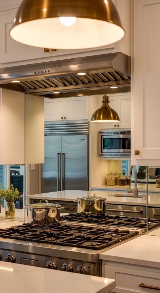 Mirror tiles used as a backsplash are unexpected and striking in a kitchen. They reflect overhead pendant lights and make compact kitchens feel less boxed in. Self-adhesive mirror tiles are available at hardware stores for very little cost and can be installed without a professional. Stick to smaller square or subway-shaped tiles behind the range for a focused, intentional look. Keep the rest of the kitchen simple so the reflective surface gets to be the moment without competing with too many other elements.