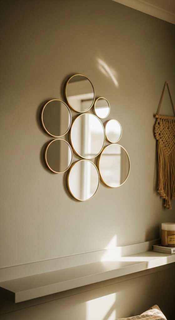 A cluster of small mirrors has more personality than one large piece. Group seven to ten small rounds together on a single wall in an organic, asymmetrical arrangement. Mirrors with thin brass, black, or silver rims look great mixed together. This works perfectly on bedroom walls, living room accent walls, or even in a small powder room. You can find packs of small decorative mirrors inexpensively online. Lay out your arrangement on the floor first, then transfer to the wall using a paper template.