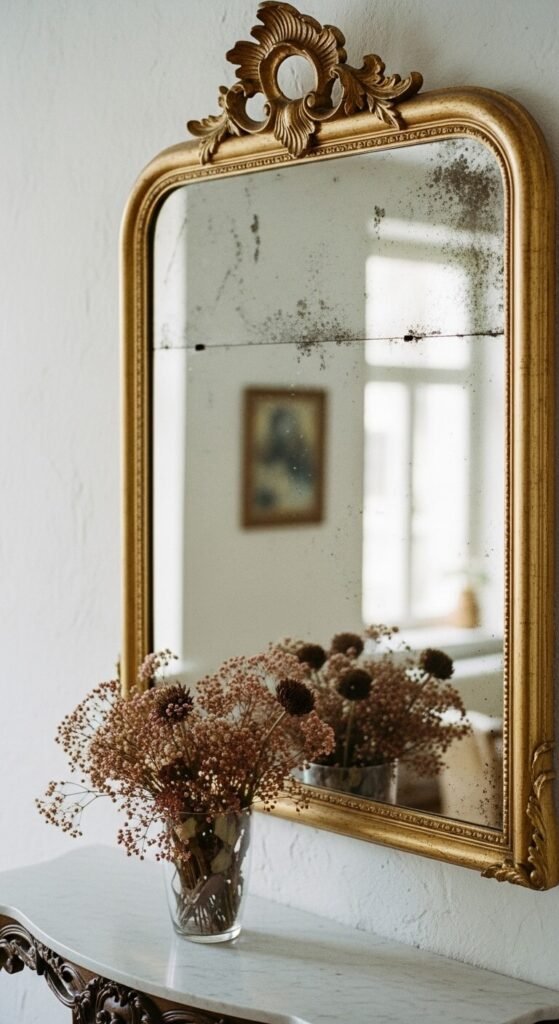 An antique mirror adds history and depth that a new mirror simply can’t replicate. The slightly aged, clouded glass gives rooms a layered, lived-in quality. Check estate sales, antique markets, and online resale platforms for pieces with beautiful worn frames. You don’t need to spend a fortune — many genuine antique mirrors sell for under $50 at markets. Even a reproduction antique-style mirror with a distressed frame gives you the same feel without the hunt. Place it in a room where warm, textured finishes already exist.