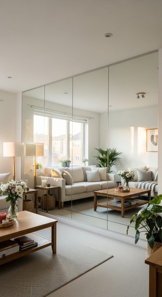 Floor-to-ceiling mirrors are a classic trick used in dance studios and luxury apartments to make spaces feel dramatically larger. A full wall of mirror panels creates the illusion of a room that never ends. Frameless mirror panels are available at glass shops and large home improvement stores. Installation typically requires professional help for large pieces, but the investment pays off in visual square footage. This works particularly well in small living rooms, home gyms, or any space that feels too enclosed.
