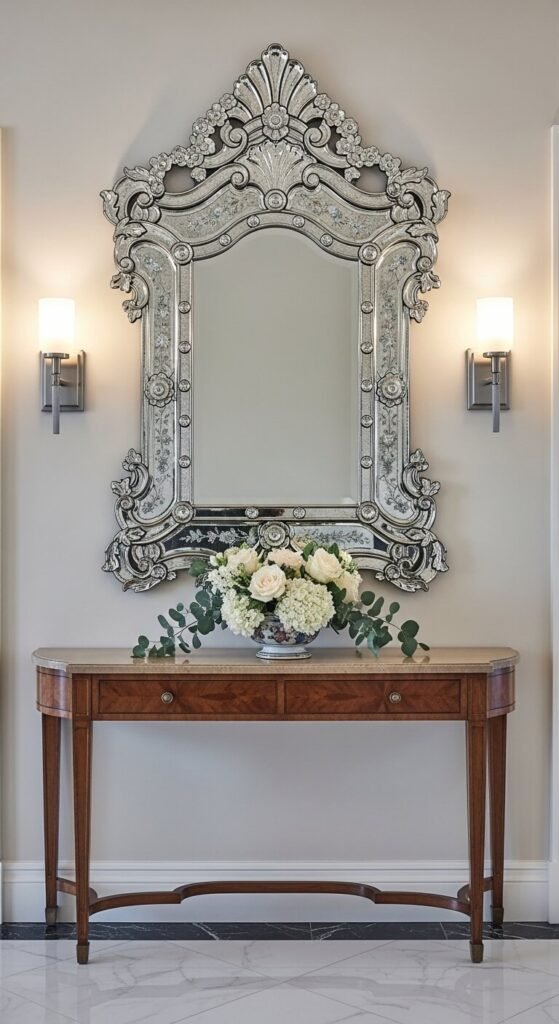 Venetian mirrors — with their intricate etched glass borders — bring an old-world elegance that few other pieces can match. They work in traditional, glam, and even eclectic spaces. Hang one above a console table in the entryway for an immediate wow moment when guests walk in. Reproduction Venetian mirrors are widely available at much lower prices than authentic ones. Their ornate frames act as art on their own. Pair with soft lighting and simple surrounding decor to let the mirror be the star.
