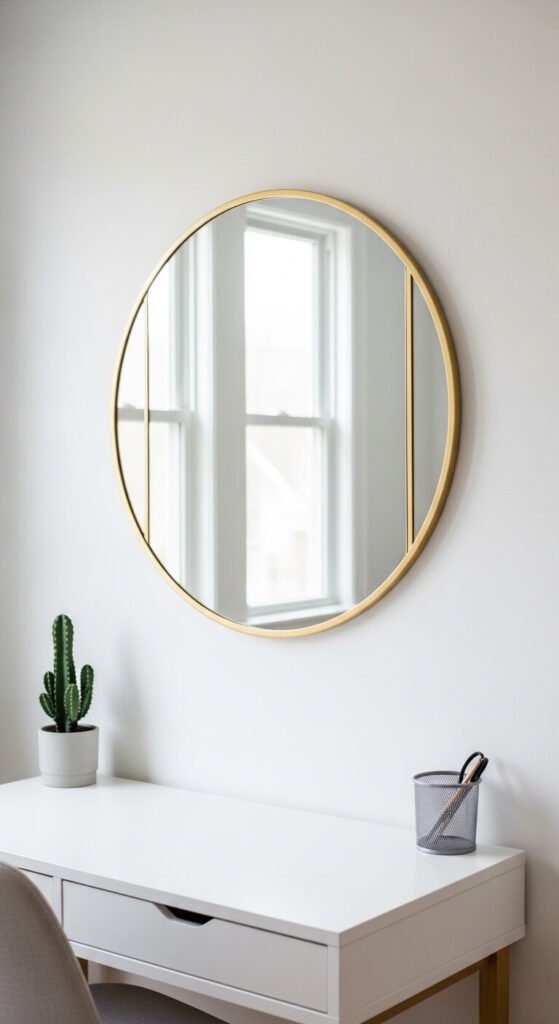 Home offices can feel like caves, especially without natural light. A strategically placed mirror beside or across from a window changes that completely. It reflects daylight into dark corners and reduces eye strain over long working hours. A round or small rectangular mirror keeps things functional without making the office feel like a bedroom. Bonus: a mirror beside your monitor can help you check posture and stay aware of your surroundings during video calls without being directly in frame.