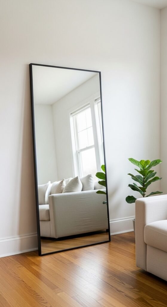 Leaning a large mirror against the wall is one of the easiest decorating moves you can make. No drilling required. It instantly adds height to the room and bounces light in every direction. Look for oversized mirrors at thrift stores or Facebook Marketplace — you can often find them for under $30. A simple coat of spray paint on the frame refreshes the whole look. Place it in a living room corner or behind a sofa for maximum impact.