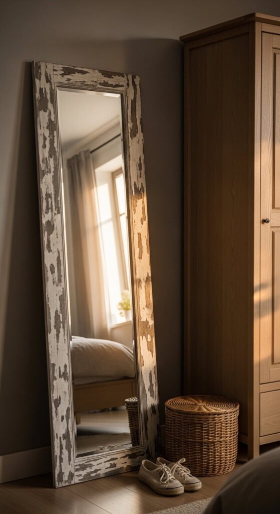 Old doors repurposed as mirror frames have serious charm. Vintage door mirrors — long, narrow, with divided panes — add architectural character to bedrooms, walk-in closets, and dressing areas. You can find them at salvage yards or antique dealers, or buy reproduction versions at home stores. The divided pane design breaks the reflection into sections, which softens the look compared to one solid sheet of glass. Lean it casually against a wall rather than hanging it for a relaxed, lived-in feel.