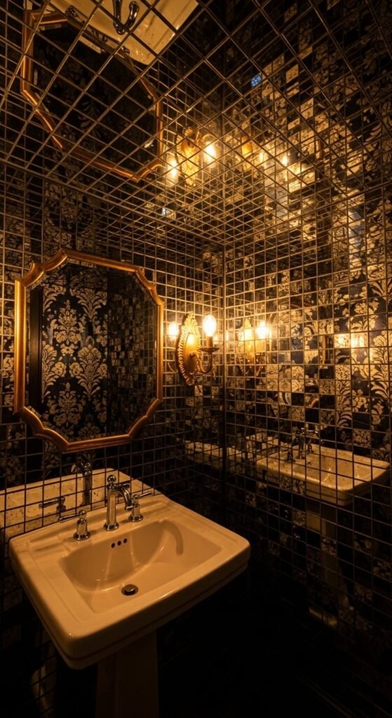 Mirror tiles on the ceiling are bold — and genuinely effective in small spaces. A mirrored ceiling visually doubles the room’s height. This works best in small powder rooms or walk-in closets where the scale is manageable. Self-adhesive mirror tiles make this a DIY-friendly project. Start at the center of the ceiling and work outward for a symmetrical grid. The reflection of lighting fixtures creates a stunning jewel-box effect. It sounds dramatic, but in a small room it reads as thoughtful and glamorous.
