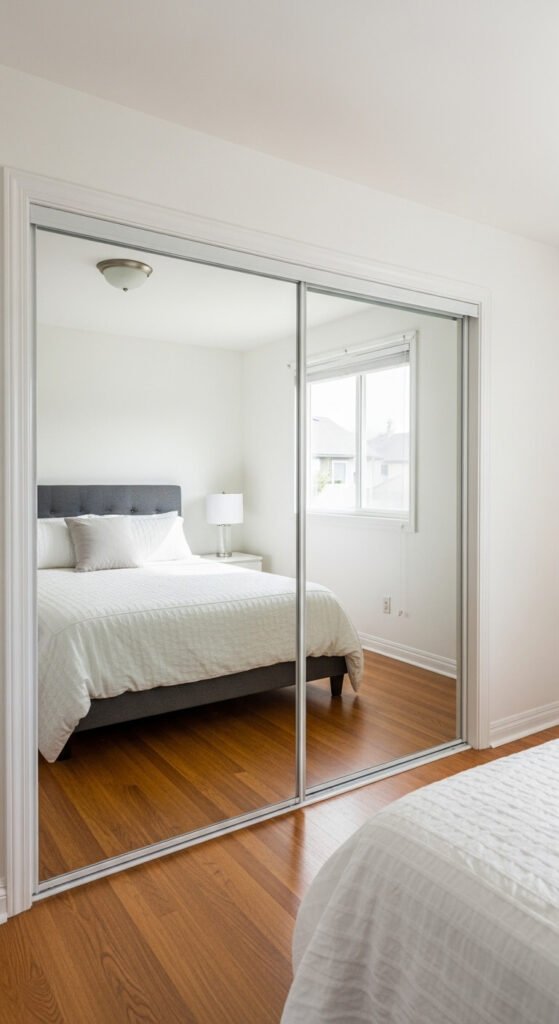 Sliding or bi-fold mirrored closet doors are a classic solution — and for good reason. They serve a practical purpose while working hard for your space. A wall of mirror across an entire closet front makes small bedrooms feel significantly larger. If the existing track and hardware are in decent shape, you can replace damaged panels with new mirror glass cut to size at a local glass shop. Go with frameless for a contemporary look, or add thin trim for a more finished appearance.