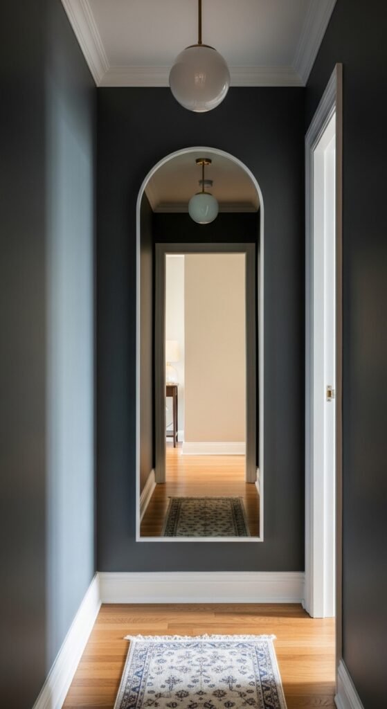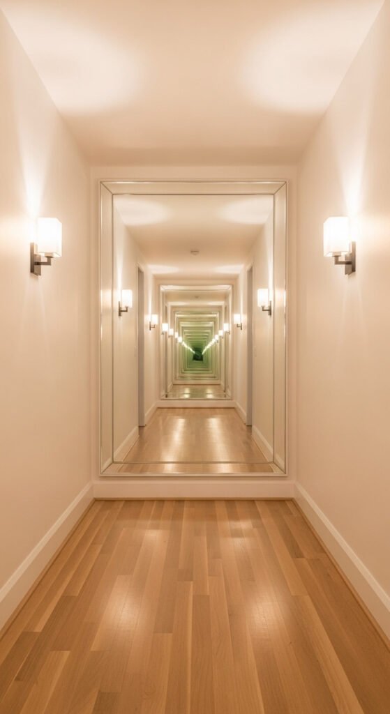 Ending a hallway with a mirror is one of the simplest optical tricks in interior design. It makes the corridor appear to continue beyond the wall, removing that boxed-in feeling entirely. Hang the mirror centered on the end wall, large enough to span most of the wall’s width. Pair it with a small console or bench below to ground the piece. The reflection of the hallway stretching back doubles the perceived length of the space without any structural changes at all.