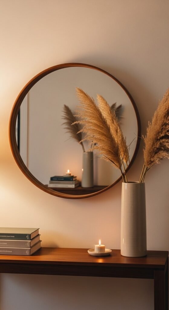 A mirror placed behind a styled vignette — a grouped arrangement of objects on a shelf, console, or dresser — does something almost magical. It reflects the objects back, creating the illusion of depth and making the arrangement feel richer and more layered. Choose a mirror that’s slightly wider than the grouping below it. Round shapes work especially well here. This trick works on entryway consoles, bedroom dressers, living room sideboards, and dining room buffets. It takes a simple shelf moment and turns it into a real design statement.