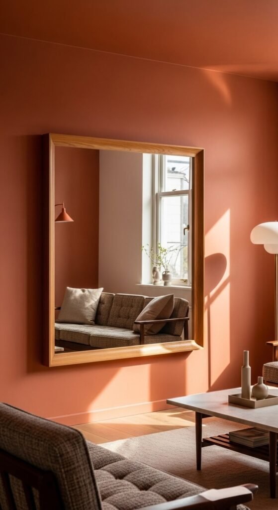 Here’s a counter-intuitive idea: paint your mirror frame the exact same color as your wall. Instead of the frame standing out, it blends in — and the mirror becomes a graphic, almost architectural element floating on the surface. This tonal approach looks incredibly intentional and modern. Use any leftover wall paint and a small foam roller for a smooth finish. It works especially well with deeper wall colors like terracotta, forest green, or navy. The result is a custom, design-forward look that costs almost nothing.