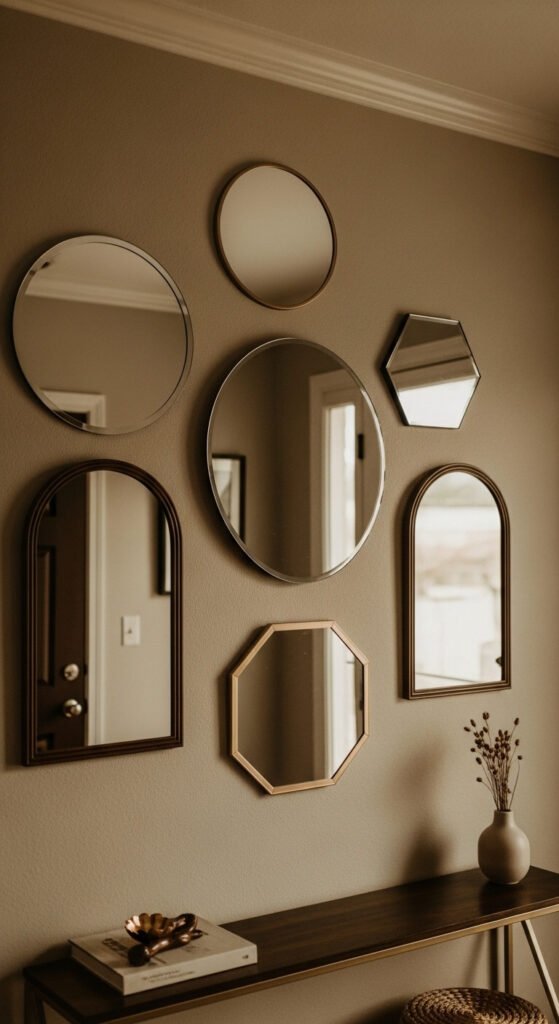 Mix round, arched, rectangular, and sunburst mirrors on one wall for a dynamic, collected look. Variety in shape keeps the eye moving. This works especially well in entryways or dining rooms. You don’t need matching frames — mismatched metals and wood tones look intentional when grouped tightly. Start by laying the arrangement on the floor before committing to wall placement. Budget tip: dollar stores and discount home shops carry small decorative mirrors perfect for filling gaps.