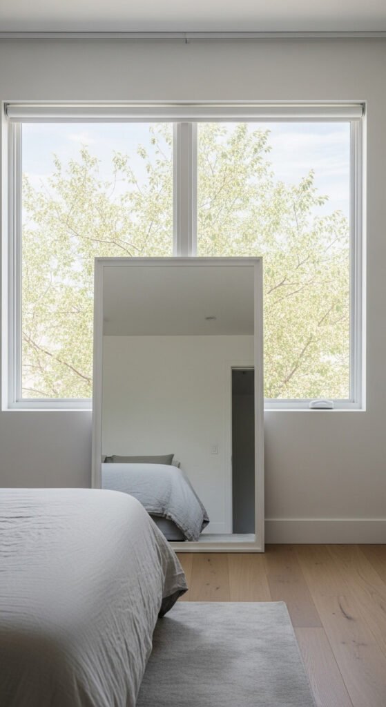 Hanging a mirror directly across from a window is the oldest trick in the book — and it works every time. The mirror doubles your natural light by reflecting the window back into the room. It also creates the feeling of a second window, which is a game-changer in dark rooms. Choose a mirror that’s roughly the same size as the window for the best effect. Even a simple frameless option from a hardware store does the job beautifully.