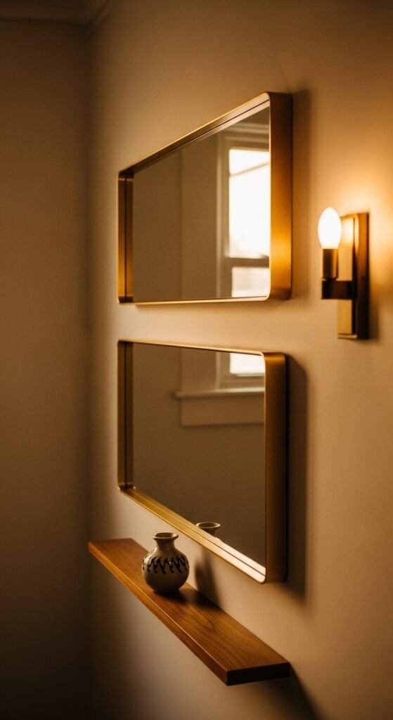 Can’t find one mirror tall enough? Stack two. Hanging two mirrors one above the other creates a striking vertical column that draws the eye upward and makes ceilings feel taller. Keep the frames matching for a clean look, or mix metals for an eclectic vibe. This works particularly well in narrow hallways where wall space is limited. Use a level and wall anchors for a secure hang. The result looks deliberate and expensive for very little cost.