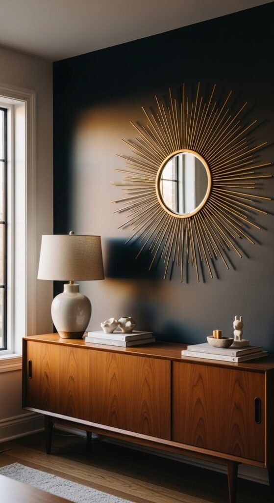 A sunburst mirror is part mirror, part sculpture. It works as wall art on its own even when it’s not reflecting much. Mount it on an accent wall above a console, sideboard, or fireplace. The radiating spokes draw the eye and add texture to flat wall surfaces. You’ll find sunburst mirrors in gold, bronze, black, and natural rattan at most home goods stores. Budget-friendly versions are available online for under $40, and they look far more expensive in person.