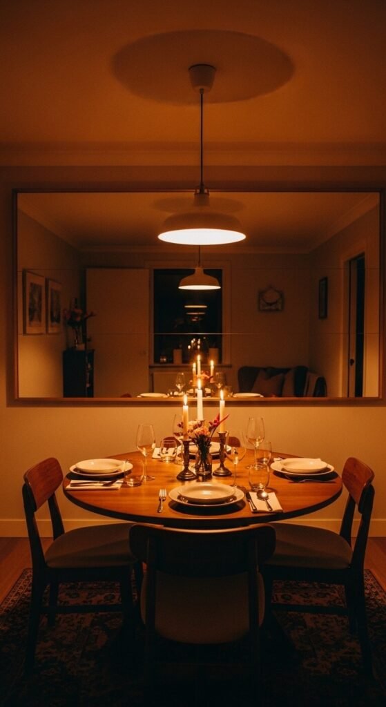 Restaurants use this trick for a reason — a large mirror along one dining room wall makes the space feel twice its size. It also reflects candlelight beautifully, making dinner feel more atmospheric. A simple frameless mirror or one with a thin metal edge keeps things elegant without overpowering the room. If hanging a large piece feels intimidating, lean it against the wall behind a console or sideboard instead. Either way, the effect is dramatic and impressive.
