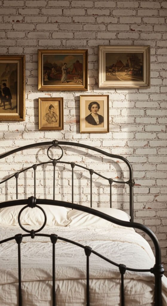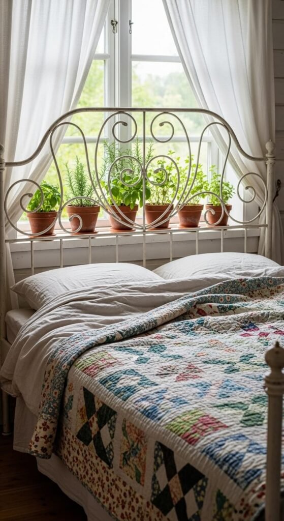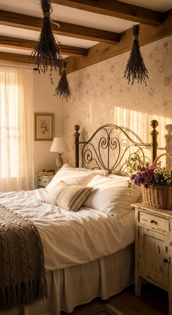 Iron bed frames bring instant vintage character. The curves and scrollwork create that romantic, countryside feel without much effort.