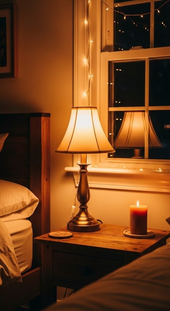 Use table lamps with fabric shades, string lights, and candles. Warm bulbs (2700K) create golden glows. Fairy lights around windows or bed frames add magic.