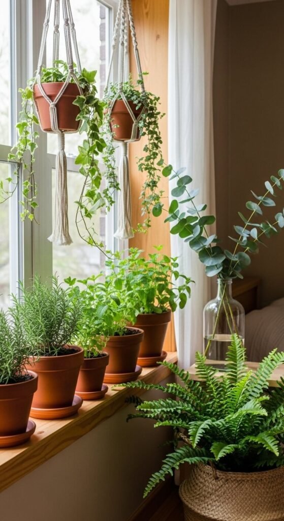 Easy plants for beginners: pothos, snake plants, spider plants. Herbs like basil or lavender smell amazing. Trailing ivy softens hard edges.