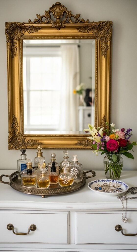 Treasure hunt: Thrift stores always have mirrors for $10-25. Spray paint the frame if you don’t love the color. Vanity trays corral small items and look intentional. Use vintage silver trays, wooden boxes, or ceramic dishes you already own.